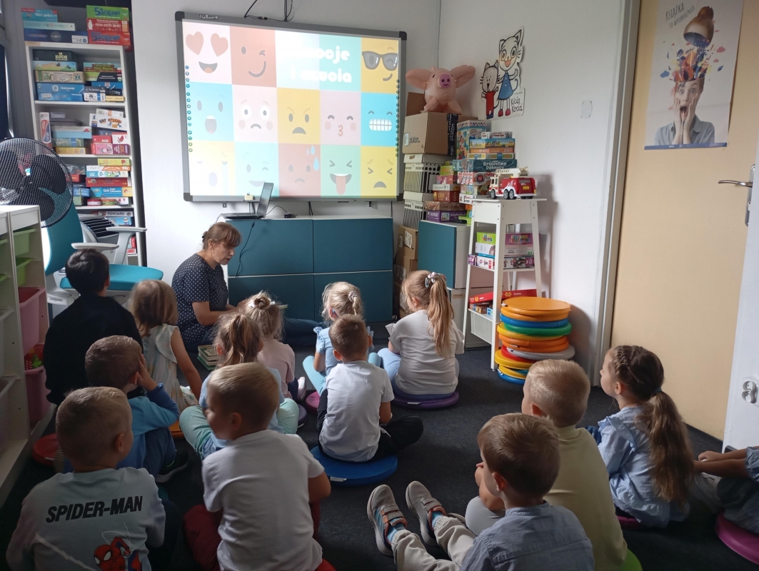 Dnia 19.09.2025 r. dzieci z grupy III wyruszyły do biblioteki filia w Piotrkowie Trybunalskim na zajęcia pt. "Emocje i uczucia". Podczas spotkanie dzieci wyruszyły w podróż po świecie emocji. Z pomocą bajek, obrazków dowiedziały się, czy, są uczucia, jak je rozpoznawać i jak sonie z nimi radzić. Poprzez wspólne czytanie, rozmowę dzieci nauczyły się ,że każda emocja - radość, smutek, złość czy strach - jest ważna i potrzebna. Zdjęcia przedstawiają dzieci podczas zajęć bibliotecznych.