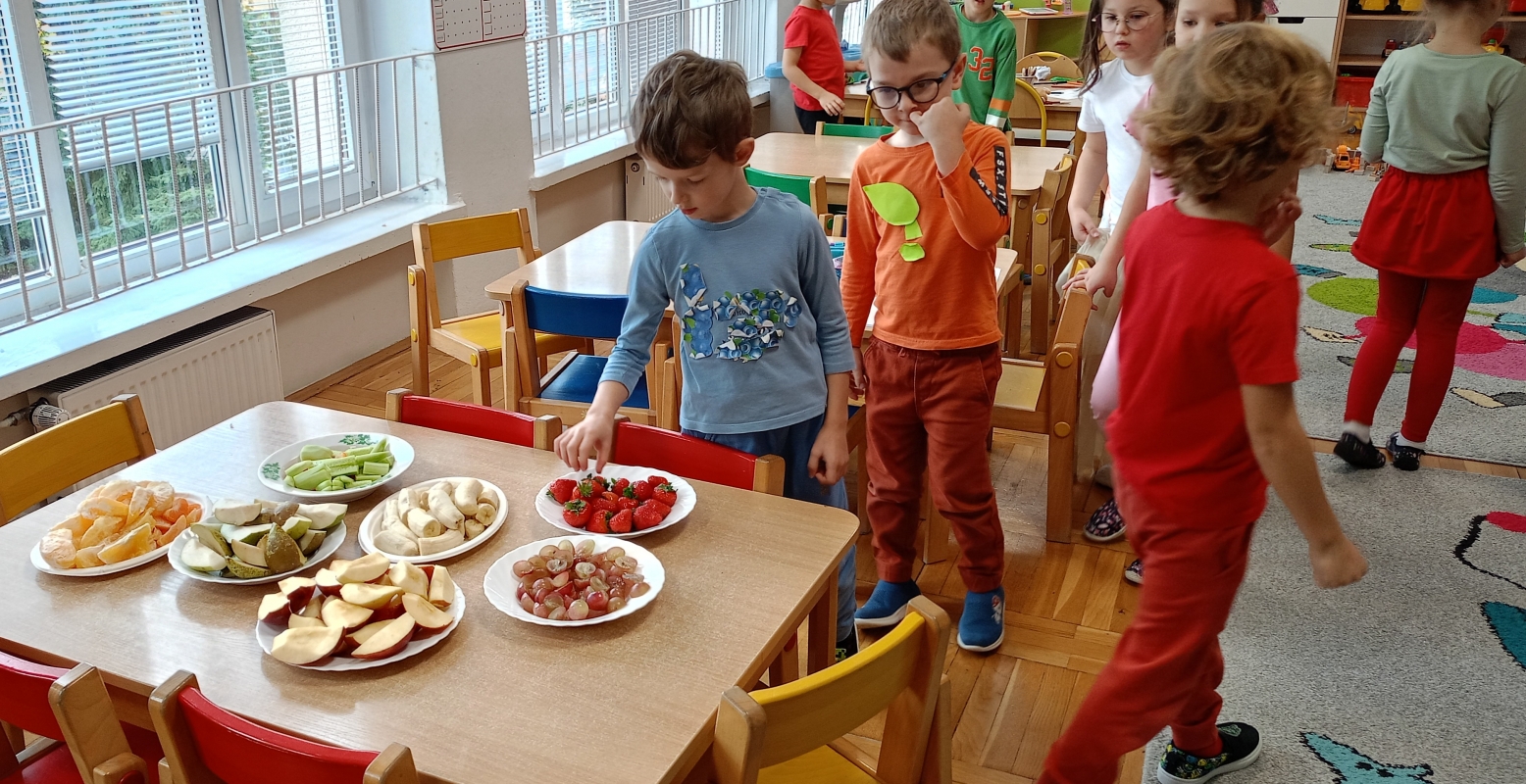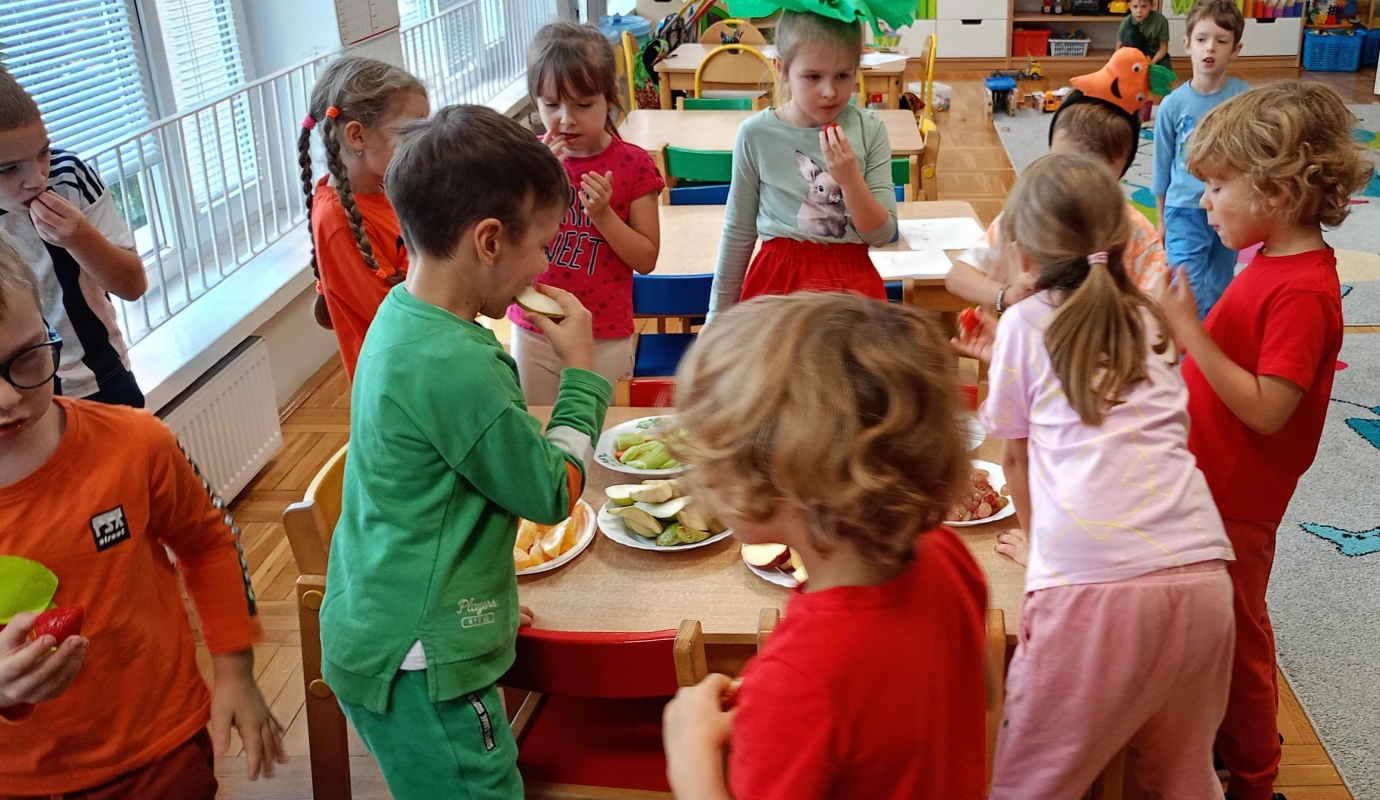 17.10.2025r. świetowaliśmy Dzień owoców i warzyw. Przebraliśmy się za ulubione warzywa lub owoce, poznaliśmy wartości odżywcze i próbowaliśmy ich smaki. samodzielnie wykonaliśmy owocowo - warzywną przekąskę. Było bardzo kolorowo , radośnie i smacznie. Zdjęcia przedstawiają dzieci podczas Dnia owoców i warzyw.