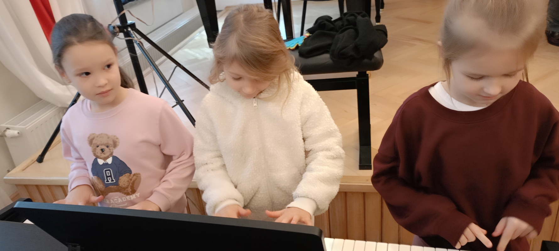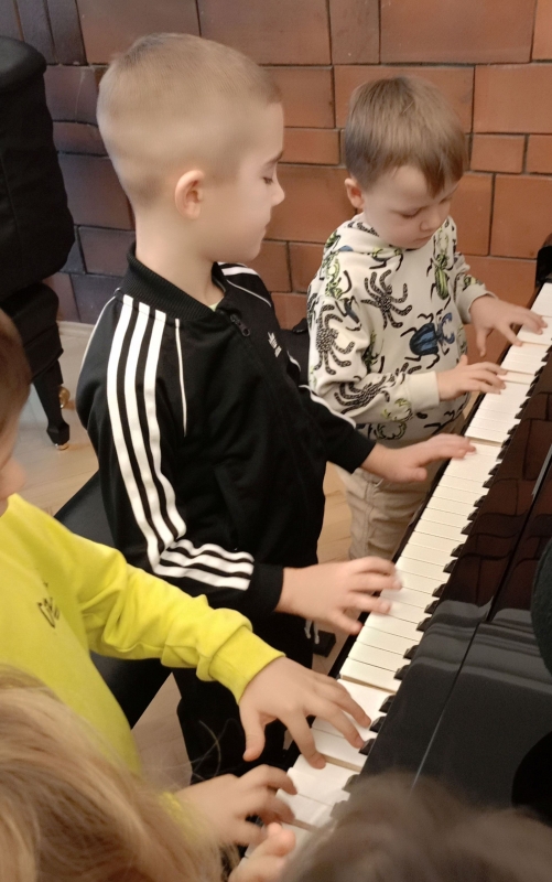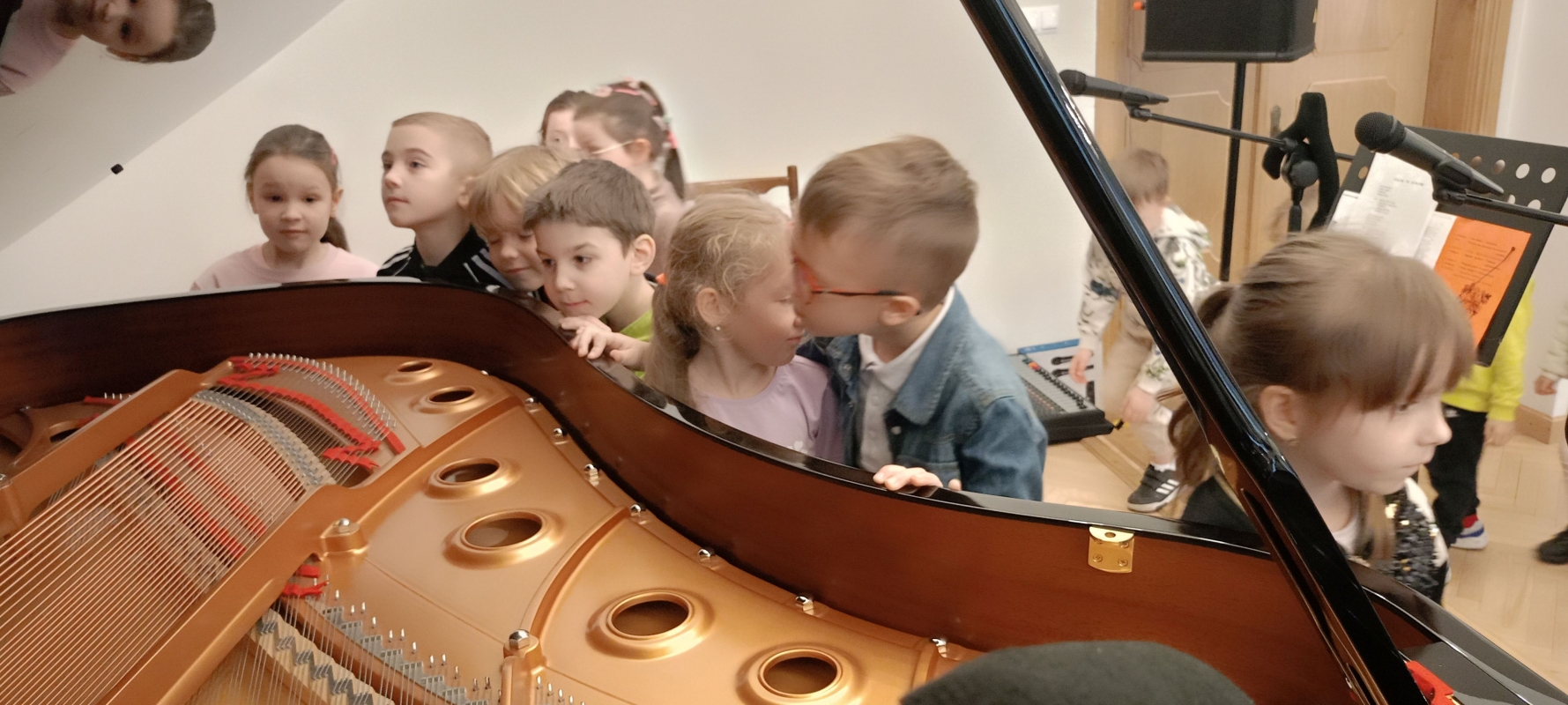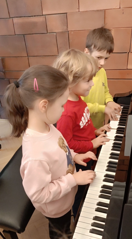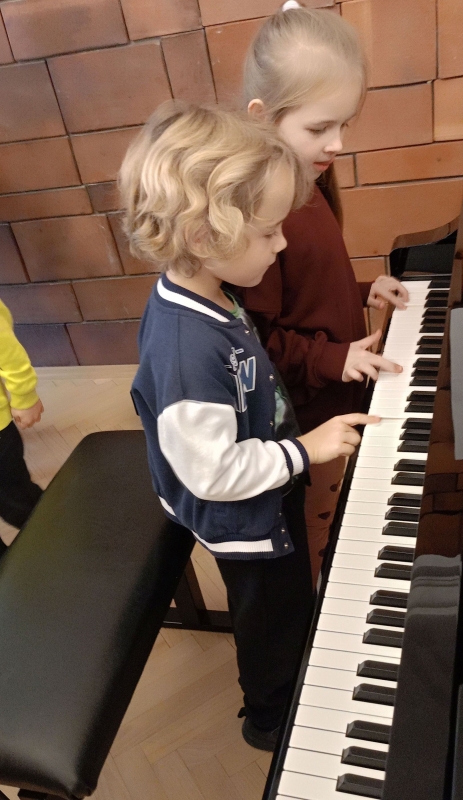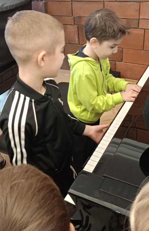 24.10.2025r. pojechaliśmy do Szkoły Muzycznej. Poznaliśmy fortepian - jego ciekawe brzmienie, różnice pomiędzy pianinem a fortepianem. Uczestniczyliśmy w audycji i mieliśmy możliwość gry na tym fascynującym instrumencie. Zdjęcia przedstawiają dzieci w Szkole Muzycznej.
