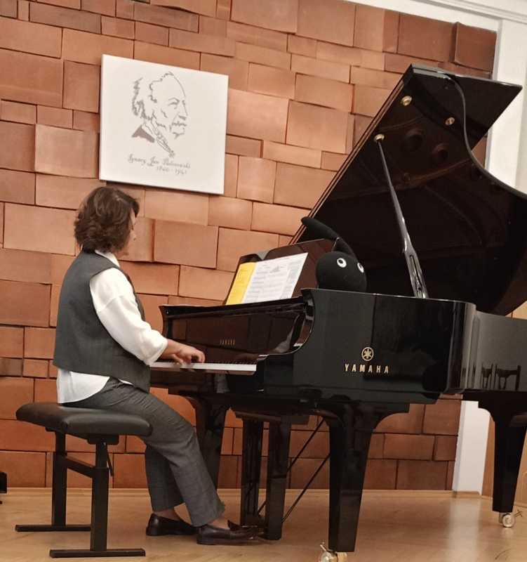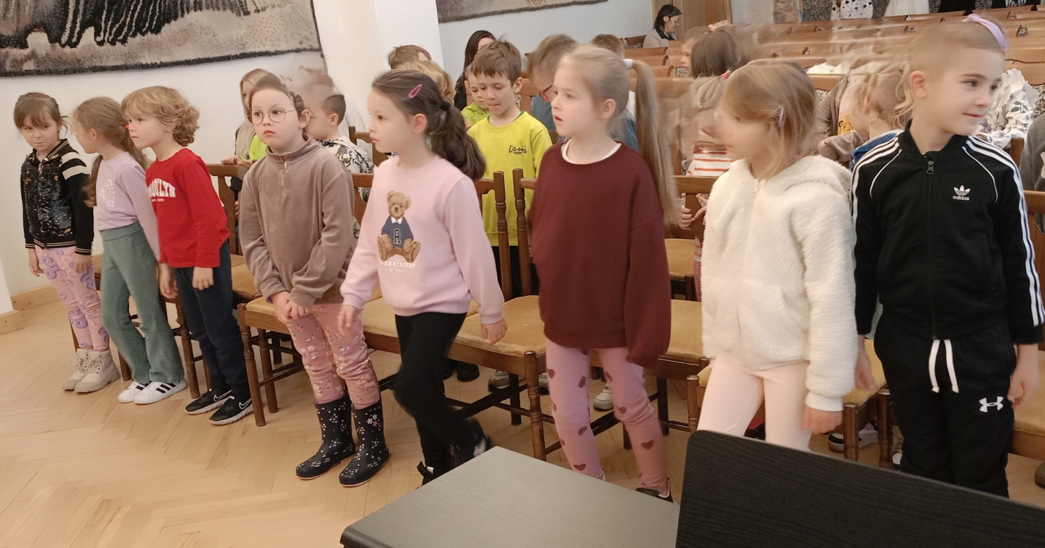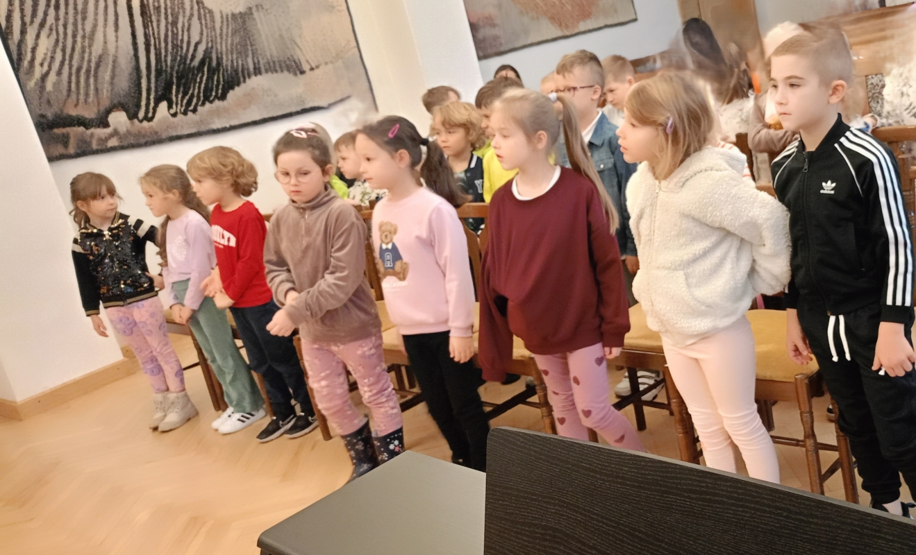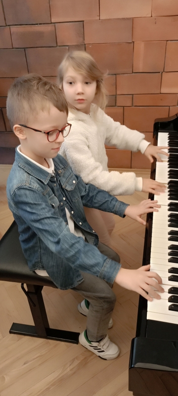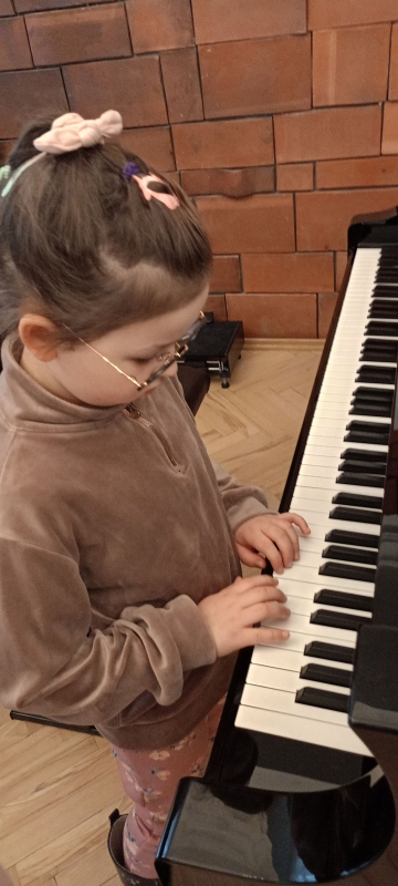 24.10.2025r. pojechaliśmy do Szkoły Muzycznej. Poznaliśmy fortepian - jego ciekawe brzmienie, różnice pomiędzy pianinem a fortepianem. Uczestniczyliśmy w audycji i mieliśmy możliwość gry na tym fascynującym instrumencie. Zdjęcia przedstawiają dzieci w Szkole Muzycznej.