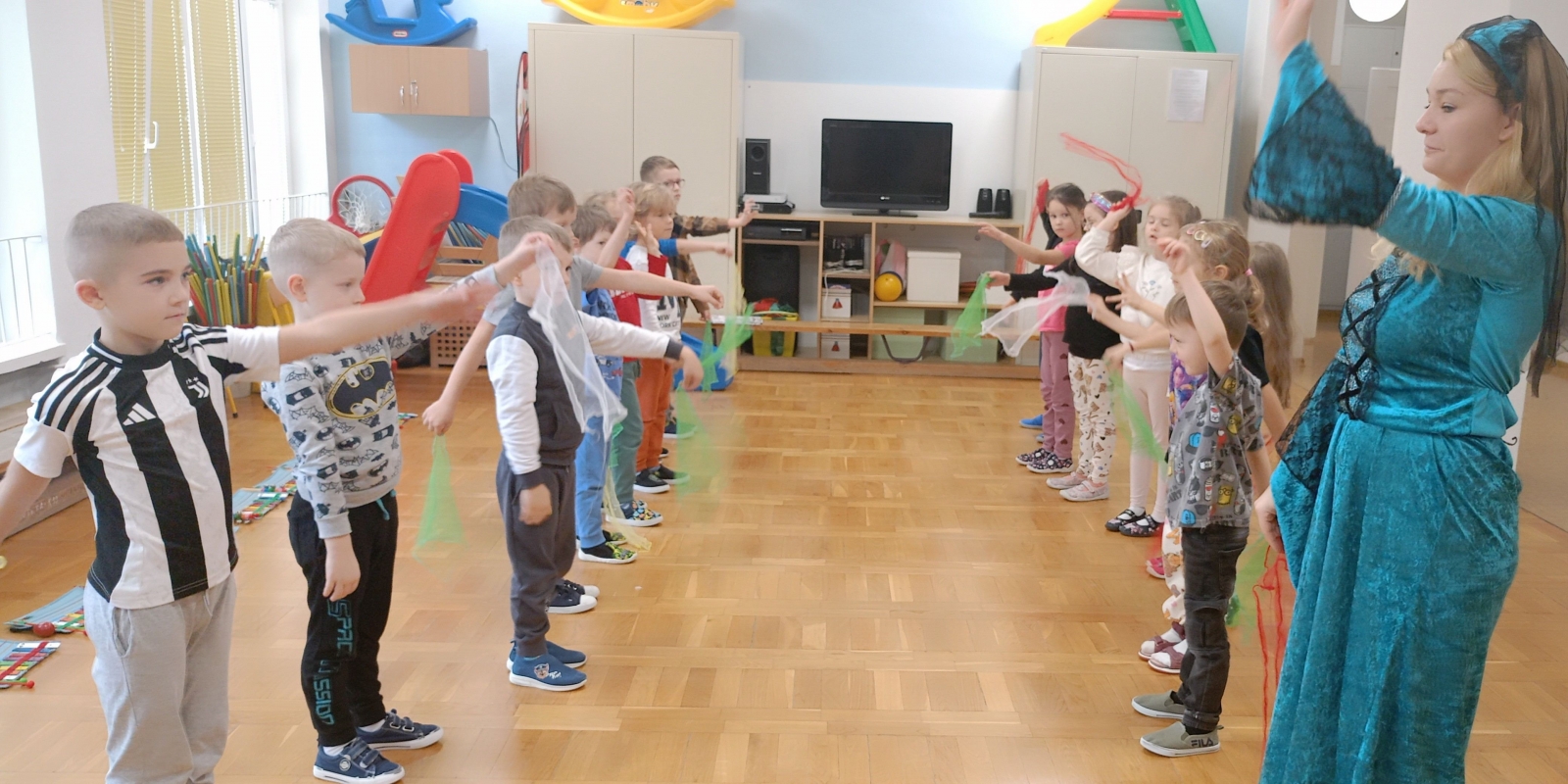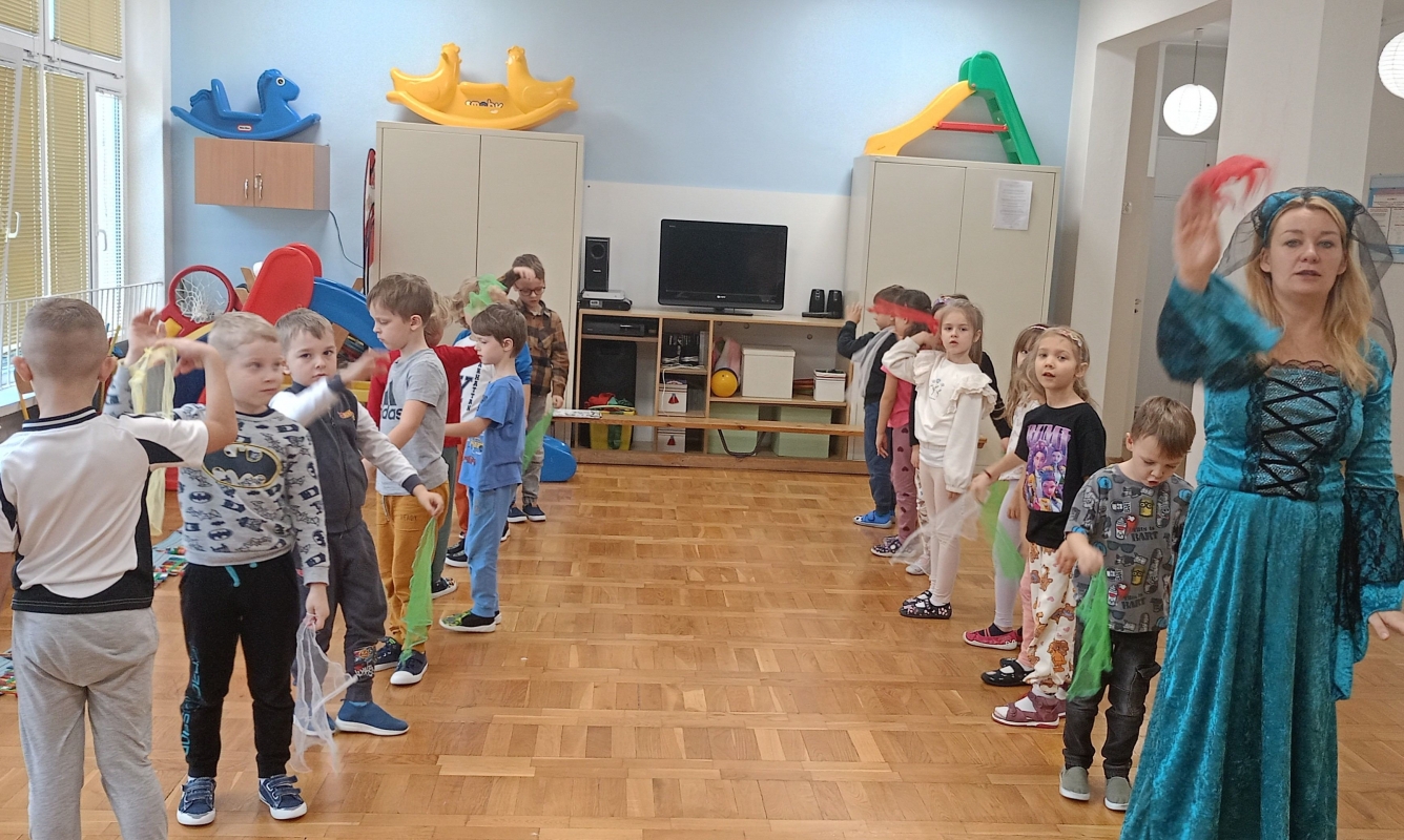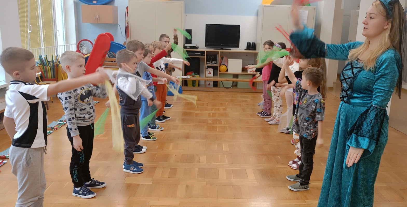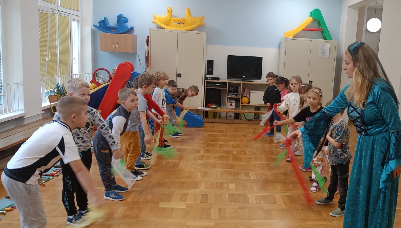 Na dworze króla - warsztaty muzyczne z panią Justyną przybliżyły nam taniec dworski menuet. Tańczyliśmy go dostojnie. Następnie poznaliśmy dworską muzykę i dużo dowiedzieliśmy się o Georgu Friedrichu Händel - kompozytorze. Graliśmy na dzwonkach i śpiewaliśmy piosenki. Zdjęcia przedstawiają dzieci podczas muzycznych warsztatów.