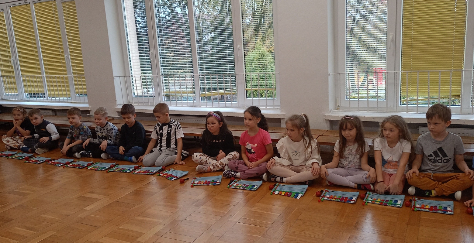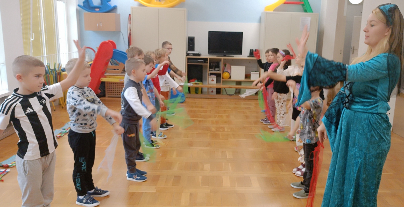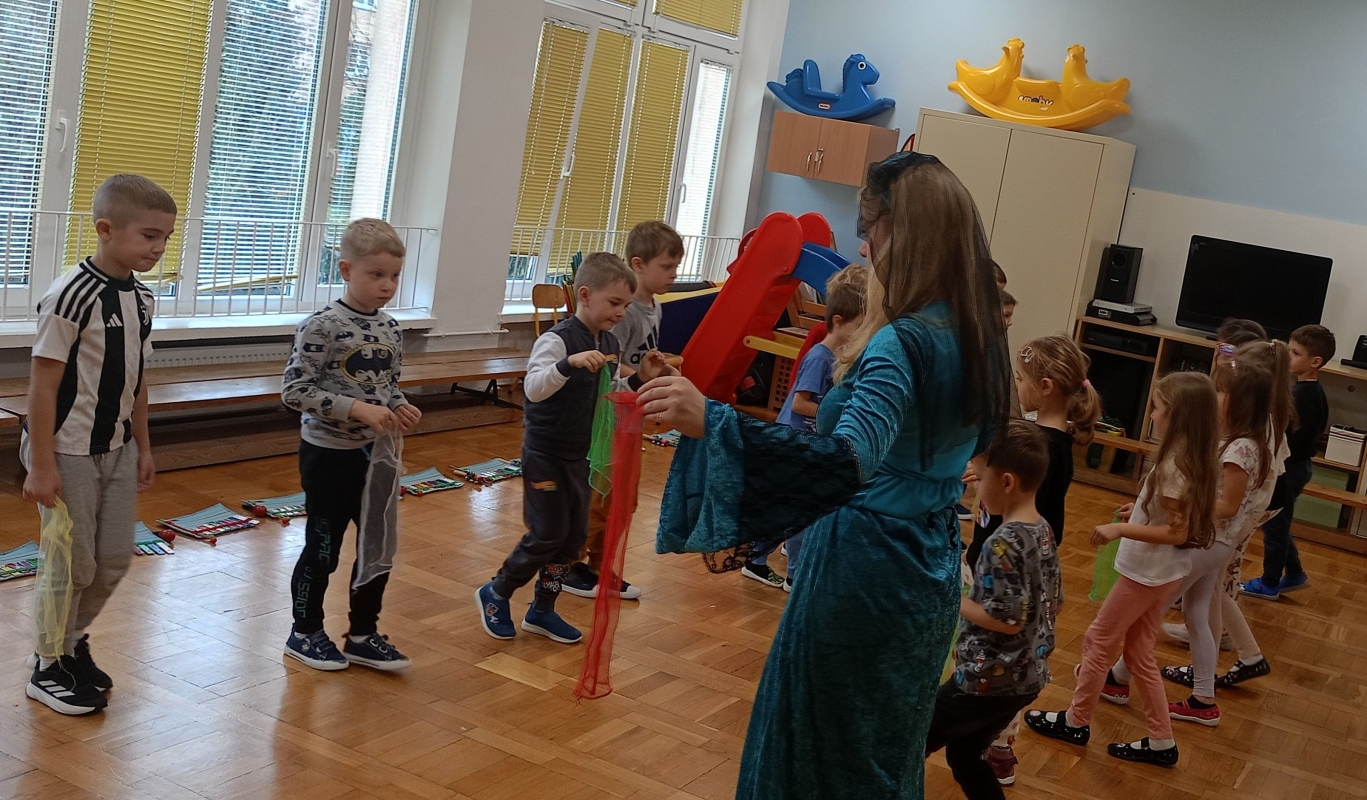 Na dworze króla - warsztaty muzyczne z panią Justyną przybliżyły nam taniec dworski menuet. Tańczyliśmy go dostojnie. Następnie poznaliśmy dworską muzykę i dużo dowiedzieliśmy się o Georgu Friedrichu Händel - kompozytorze. Graliśmy na dzwonkach i śpiewaliśmy piosenki. Zdjęcia przedstawiają dzieci podczas muzycznych warsztatów.