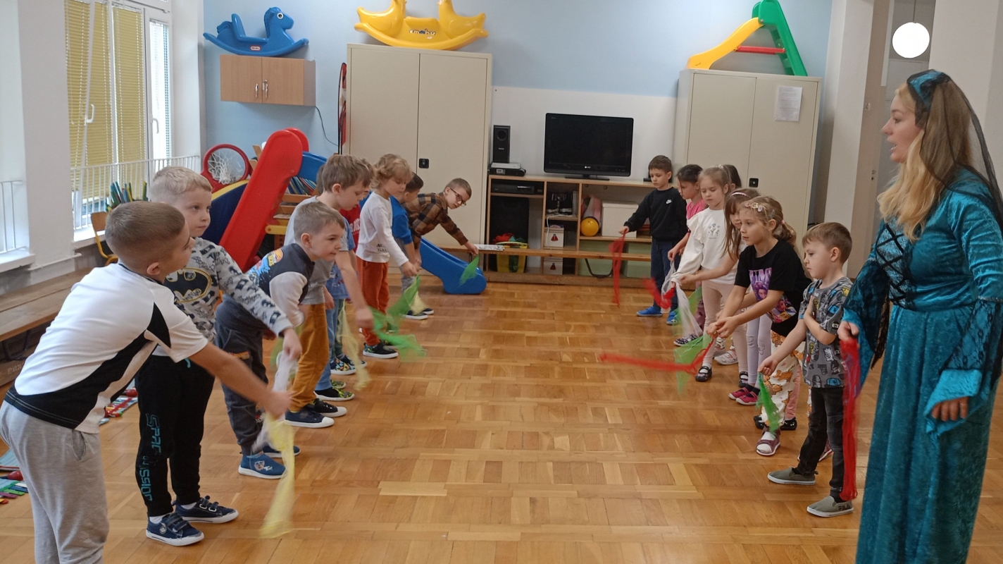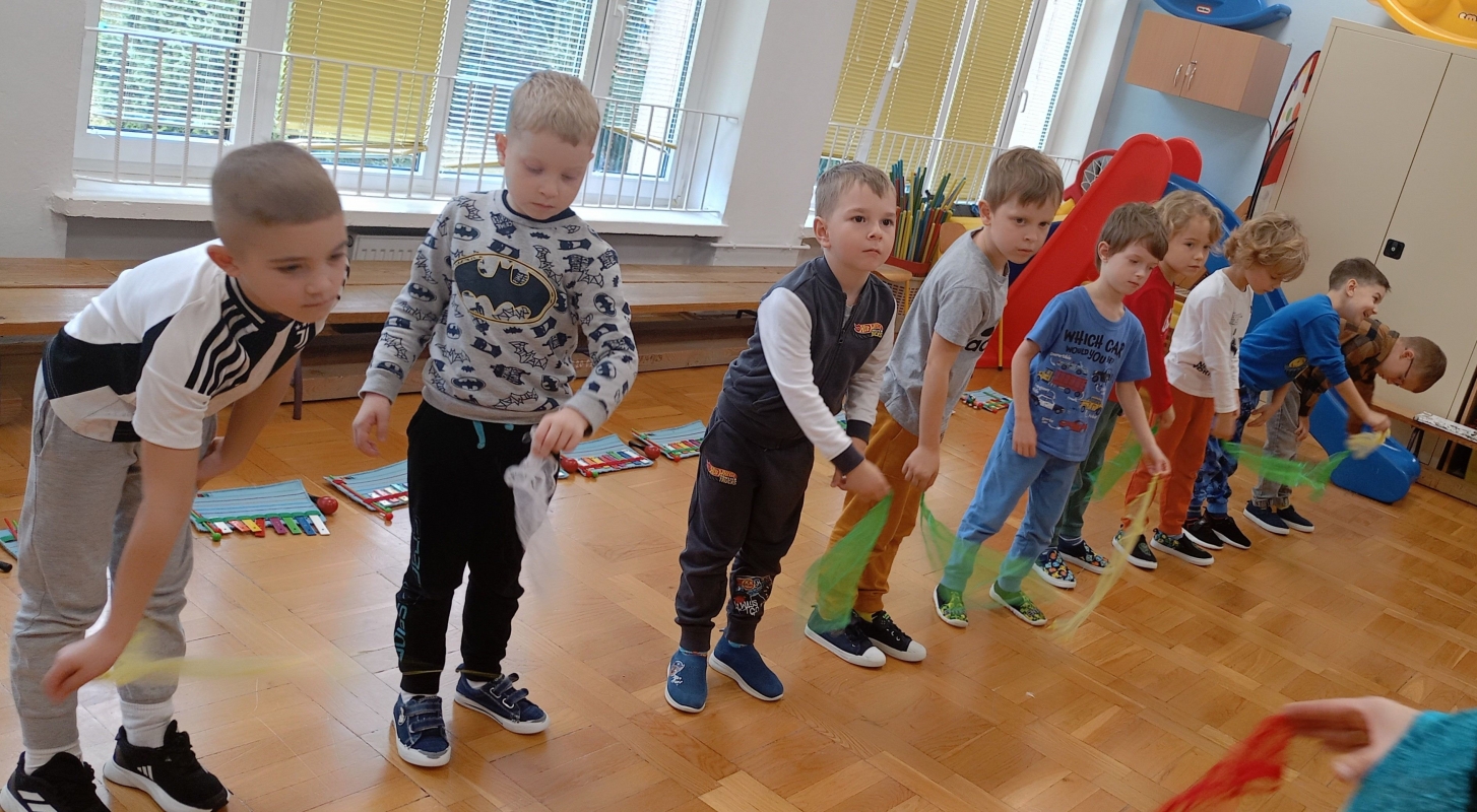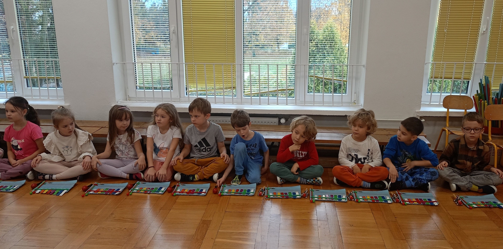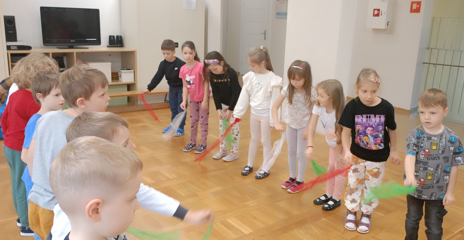 Na dworze króla - warsztaty muzyczne z panią Justyną przybliżyły nam taniec dworski menuet. Tańczyliśmy go dostojnie. Następnie poznaliśmy dworską muzykę i dużo dowiedzieliśmy się o Georgu Friedrichu Händel - kompozytorze. Graliśmy na dzwonkach i śpiewaliśmy piosenki. Zdjęcia przedstawiają dzieci podczas muzycznych warsztatów.