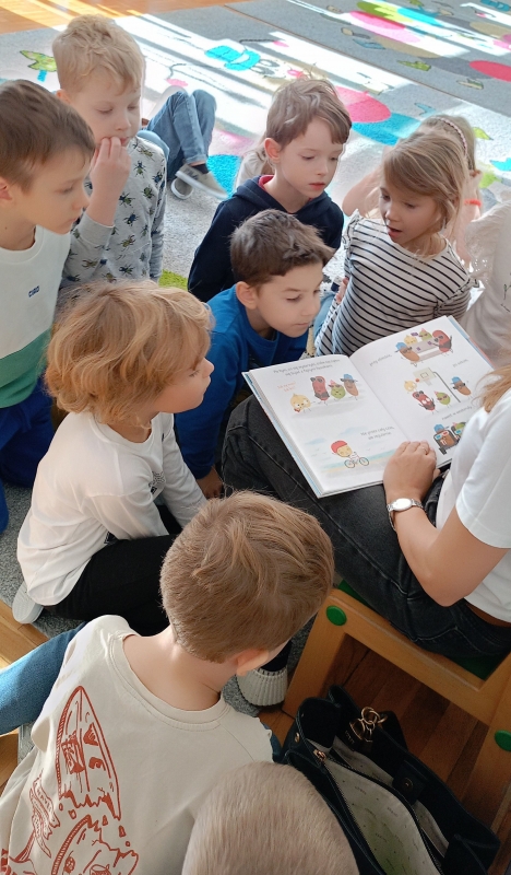 23.10.2025r. Pani Monika, mama Oliwierka i Antosia czytała dzieciom wspaniałą książkę " " Fajny cieciorek" - super opowieść o ziarenku ciecierzycy . Zdjecia przedstawiają dzieci podczas czytania książki.
