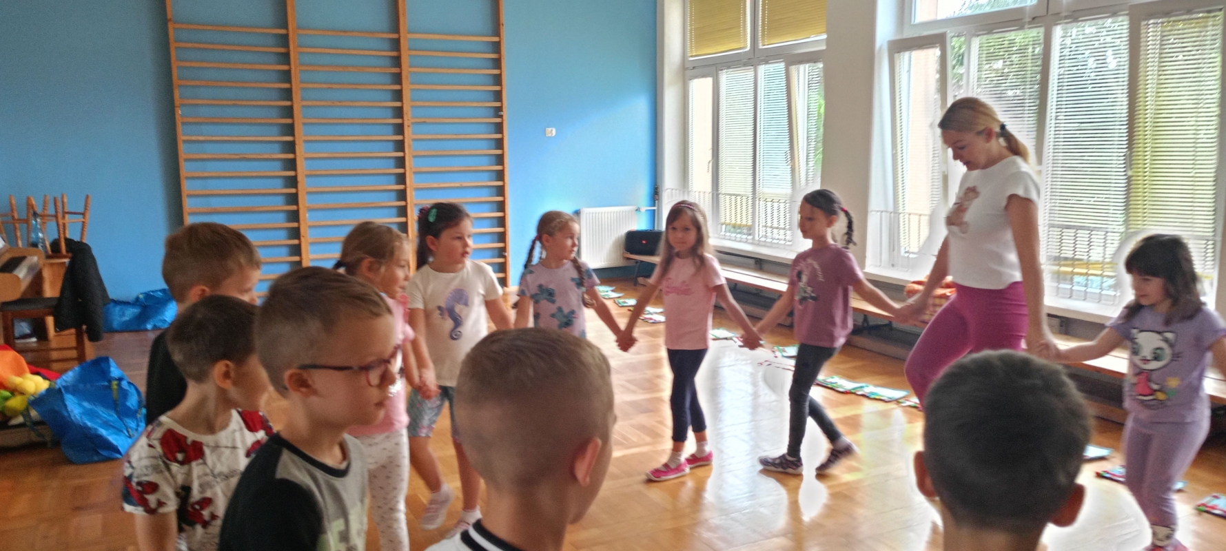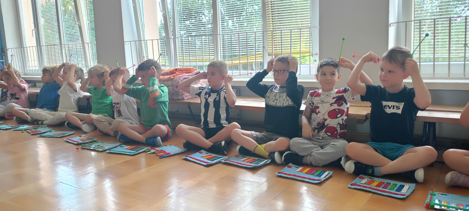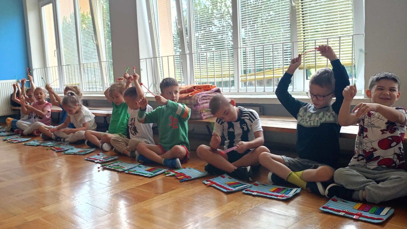 Dzisiaj na warsztatach uczyliśmy się grac gamę na dzwonkach. Zdjęcia przedstawiają dzieci na warsztatach muzycznych.