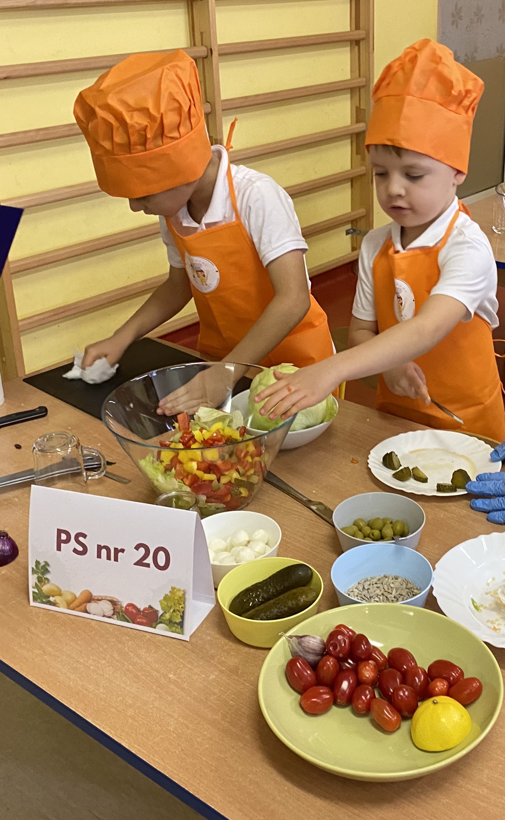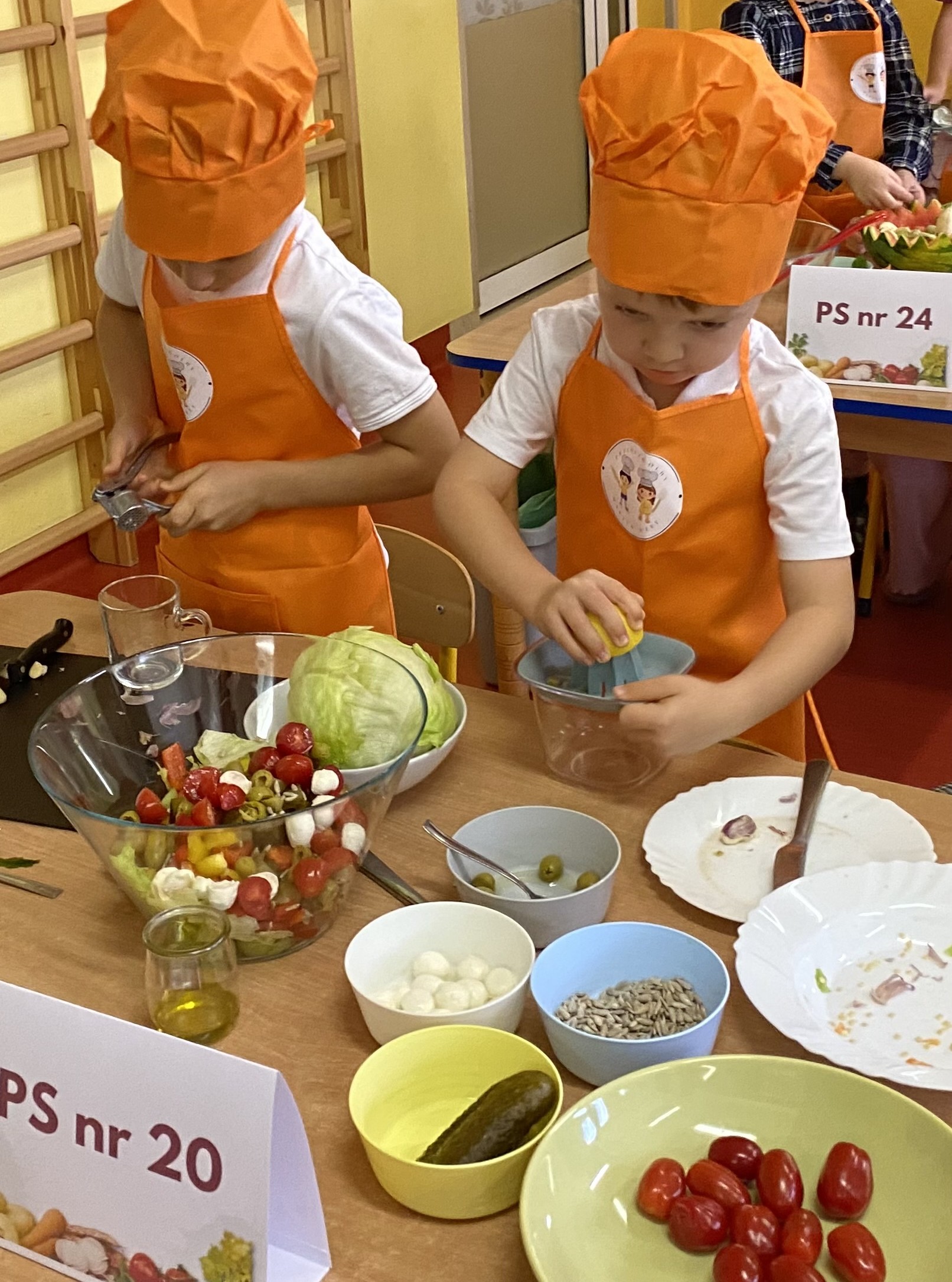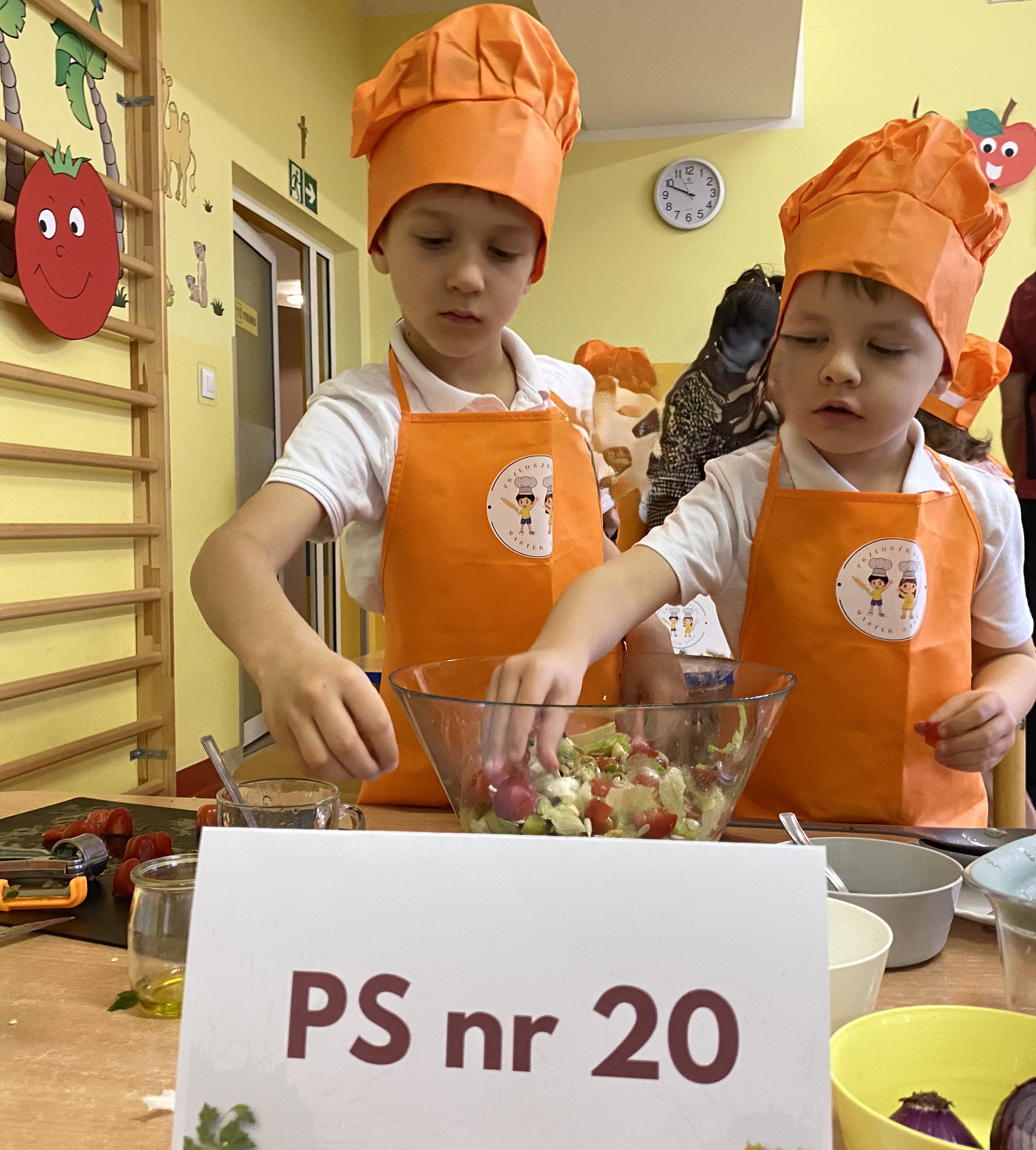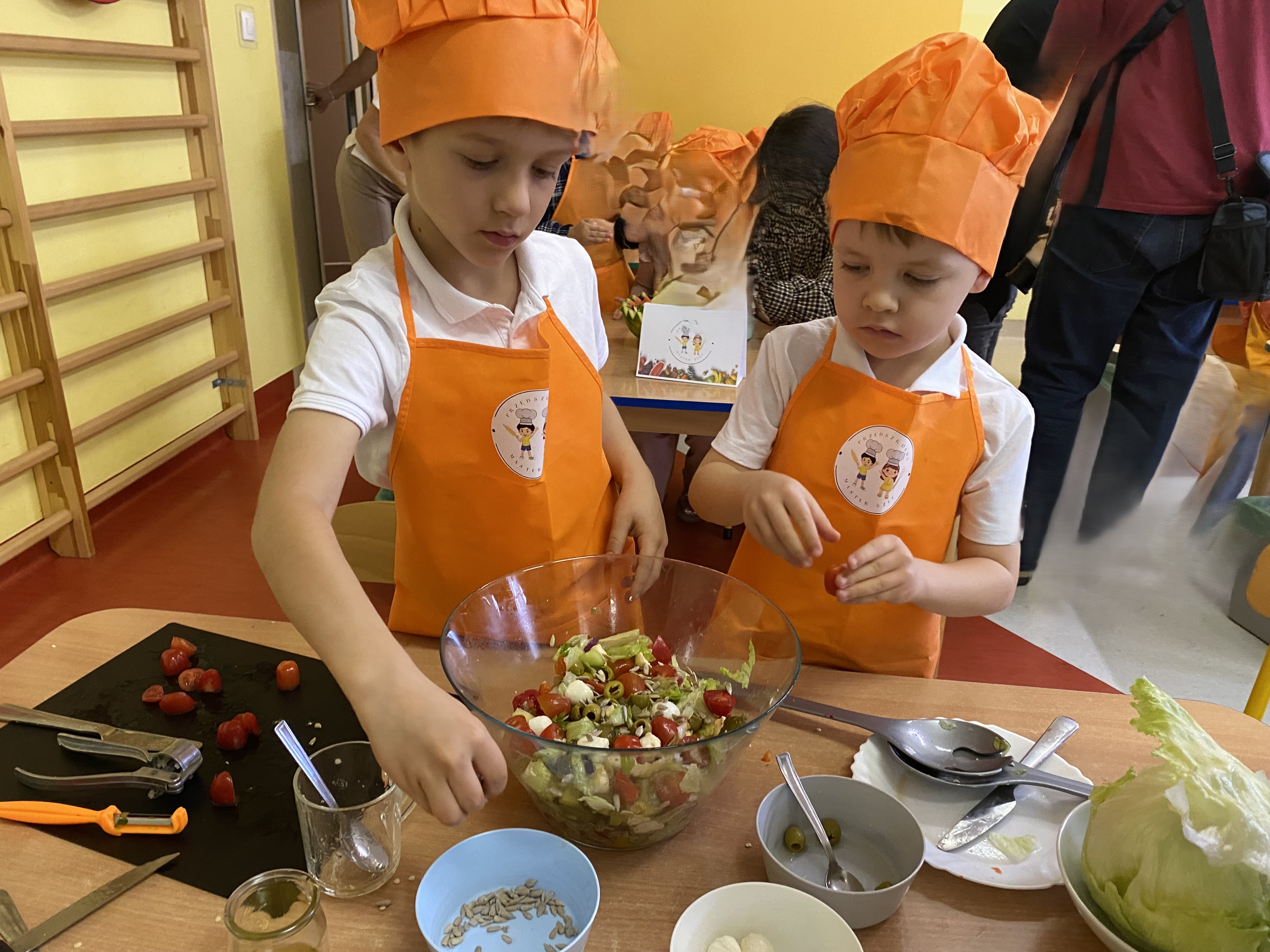 Nasze przedszkole w konkursie reprezentowali Oliwier K. i Krzysztof W. z grupy 4. Chłopcy samodzielnie przygotowali sałatkę i zaprezentowali przed jury jej walory zdrowotne. Gratulacje !!! Zdjęcia przedstawiają dzieci podczas konkursu Master Szef.