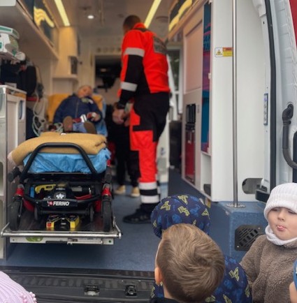 7.10.2025r. dzieci miały spotkanie z ratownikiem medycznym i odbyło się szkolenie z zakresu pierwszej pomocy. Ćwiczyliśmy na fantomie , oglądaliśmy karetkę. Było bardzo ciekawie.