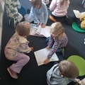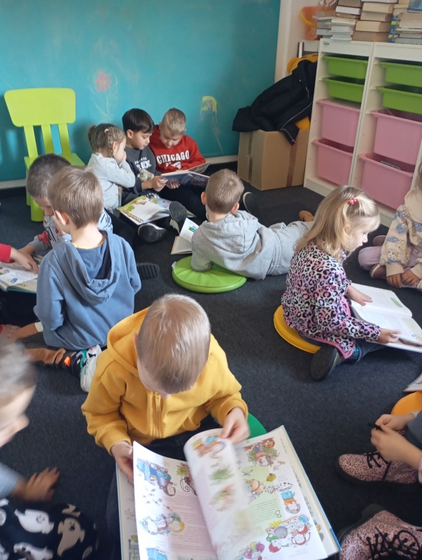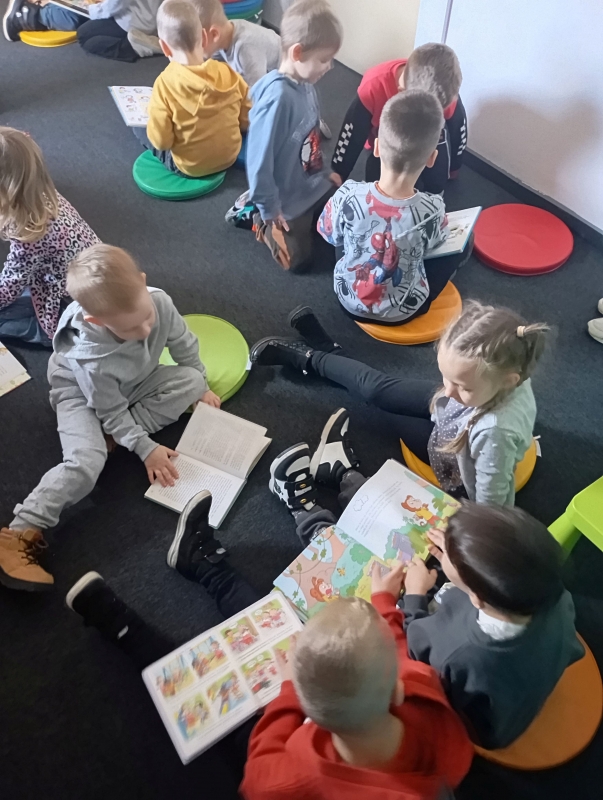 Zdjęcia przedstawiają dzieci podczas zajęć w bibliotece.