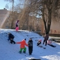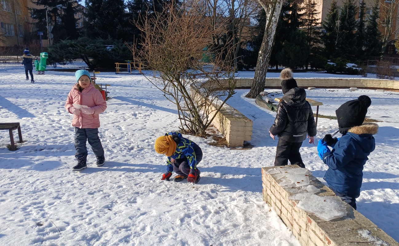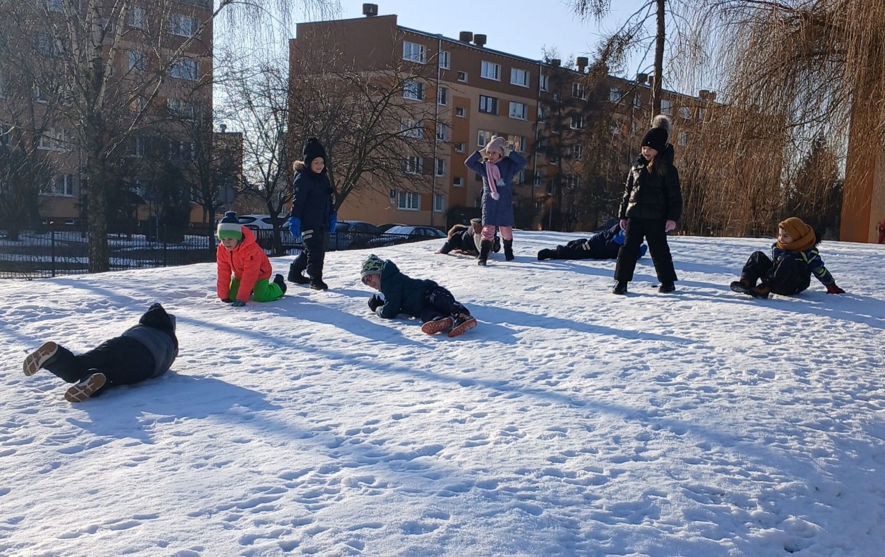 Zdjęcia przedstawiają dzieci podczas zabaw na śniegu.
